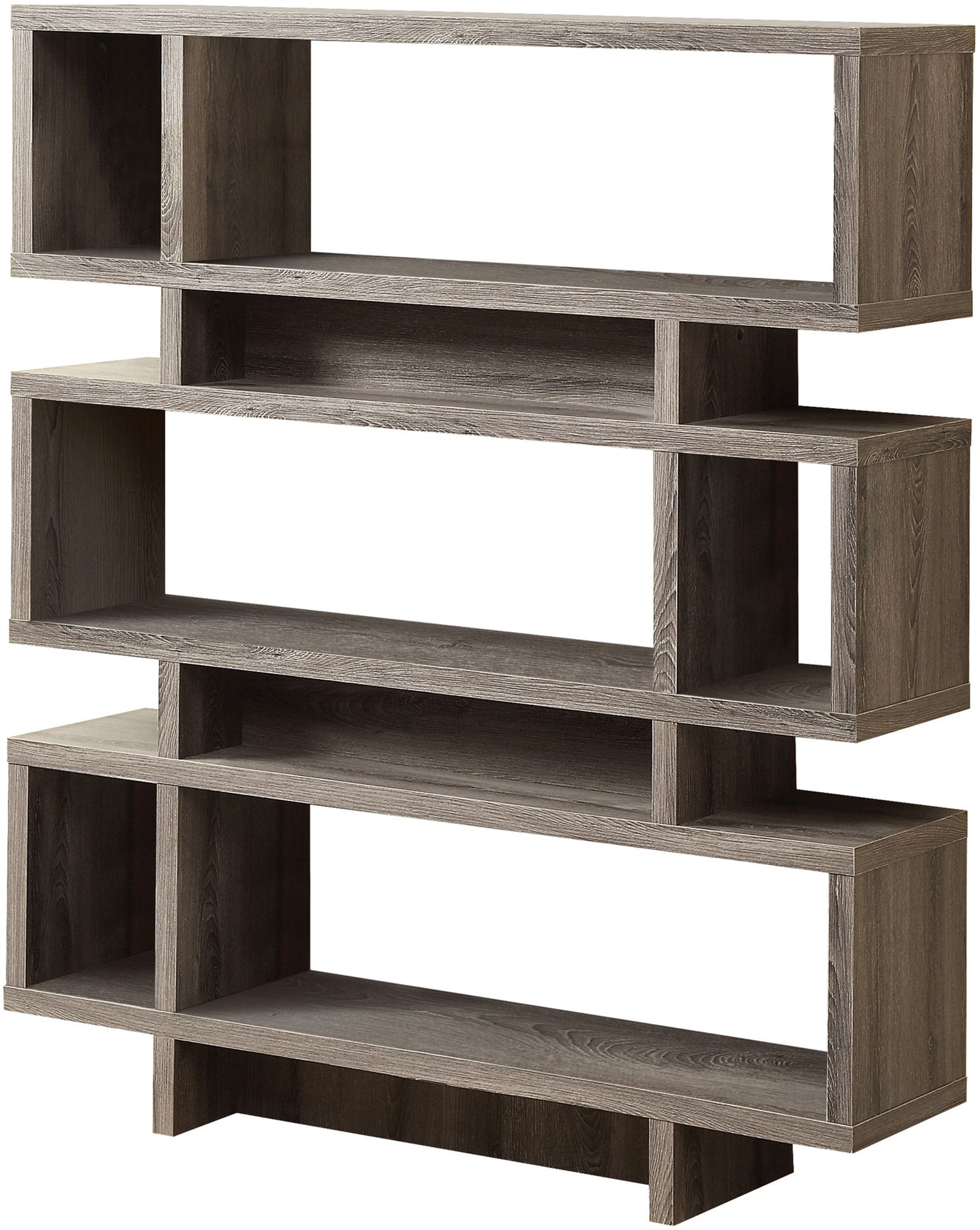 Add some pizzazz to your home or office space with this 55" high bookcase! With a smooth dark taupe reclaimed wood-look finish, this bookcase has ample room for displaying pictures, decorative pieces, and storing books. Both beautiful and versatile, place it in the center of a room to separate and provide more intimacy as the bookcase is finished on all sides, hick paneling, a sturdy structure and innovative features, this contemporary style bookcase gives visual appeal to any decor. Assembly is required.