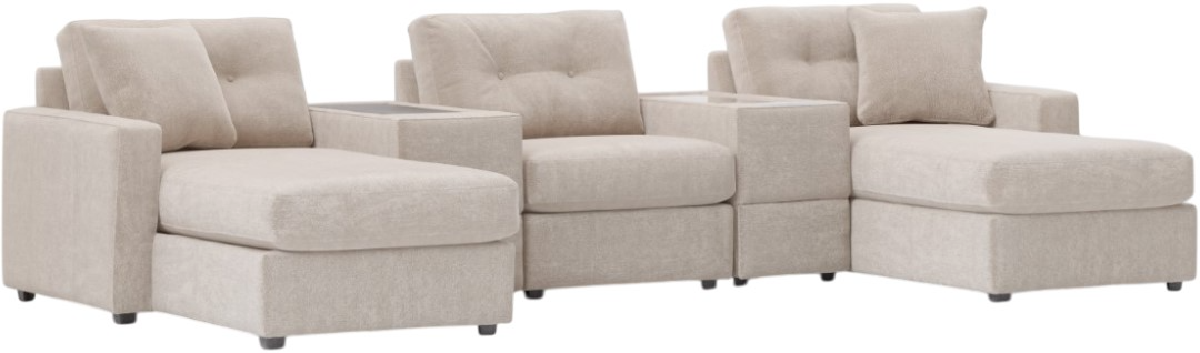 Includes includes right arm chaise, left arm chaise, one storage console without electric, one storage console with electric components, one armless chair