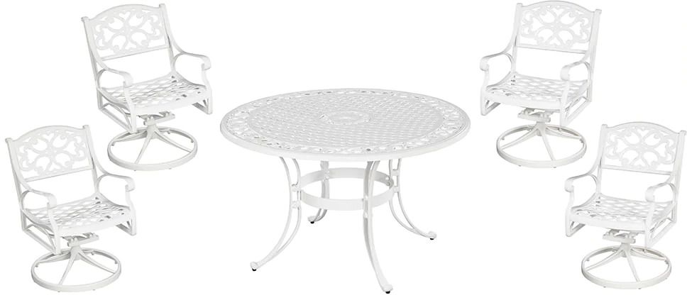 The difference between an average backyard and an open air sanctuary is found the classic comfort and traditional style that Sanibel delivers. This 5-piece dining set includes a round table and four swivel chairs, all made of cast aluminum with a powder-coated finish and a clear coat that offers total protection from the elements. The table top and seat design allows water to quickly drain through to prevent pooling or staining. The center umbrella hole includes a cap to cover it when not in use.
