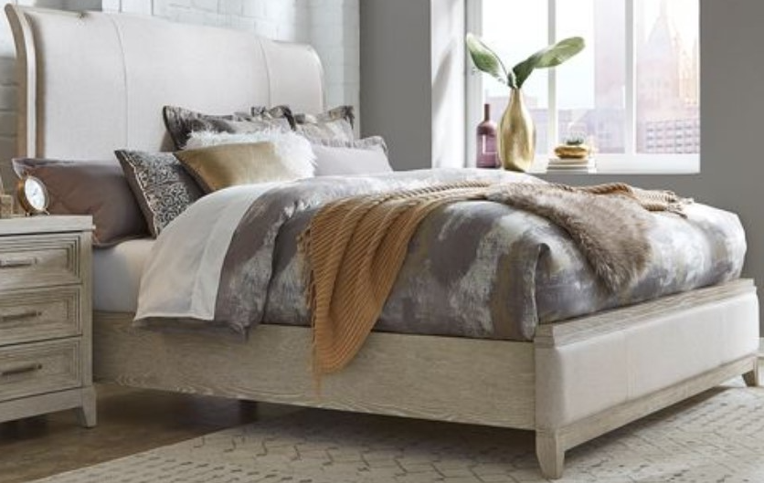 Invite this luxurious Belmar upholstered bed into your bedroom. Crafted with rubberwood solids and split heart oak veneers, the washed taupe and silver champagne finish is accented by dusty gray wax that creates a unique look from piece to piece.Read More