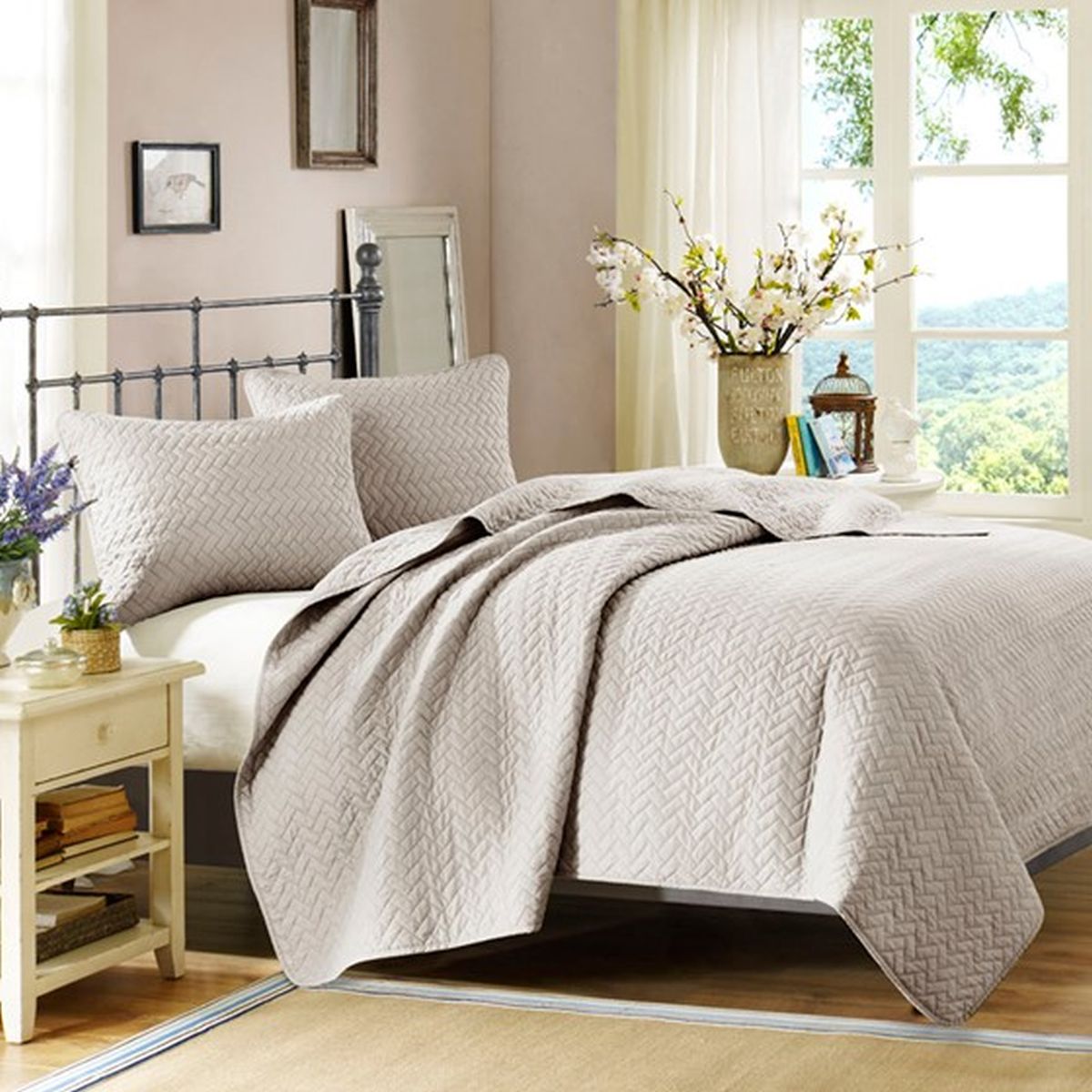 The Velvet Touch Coverlet is an easy and refreshing addition to your bed. This three piece quilted patterned coverlet set is 100% polyester with cotton batting and then pre-washed to give a luxurious "puckered" effect. This set also includes two standard shams.