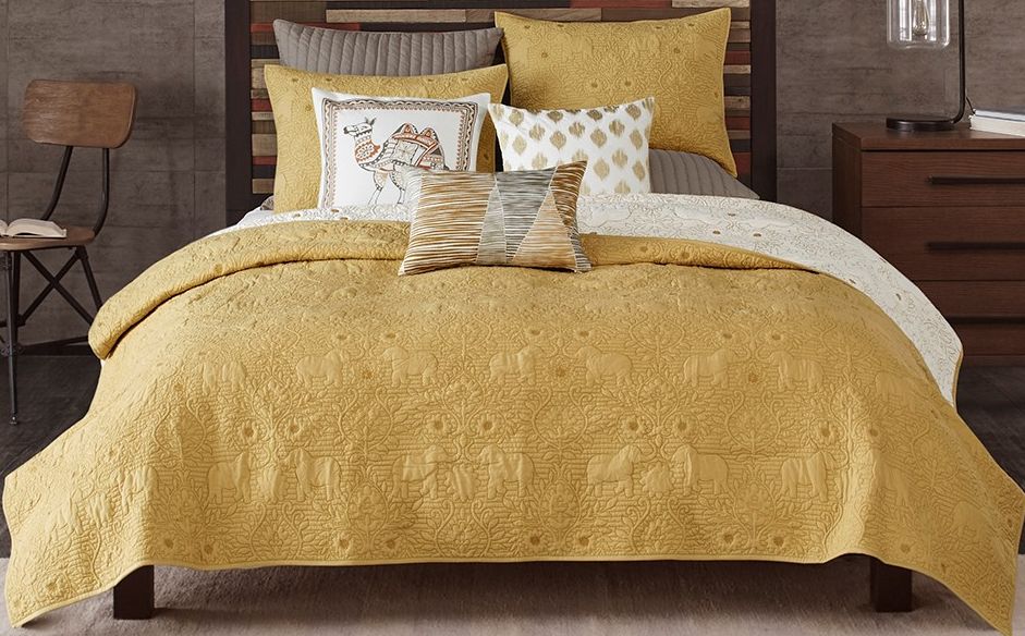 The INK+IVY Kandula Coverlet Set provides all the elements of a unique, casual look for your bedroom. The rich, mustard yellow color is accentuated with dark quilting featuring adorable elephants and flowers. The reverse side is a lighter off white color while the quilting remains dark-colored for a completely different look on the reverse.Read More